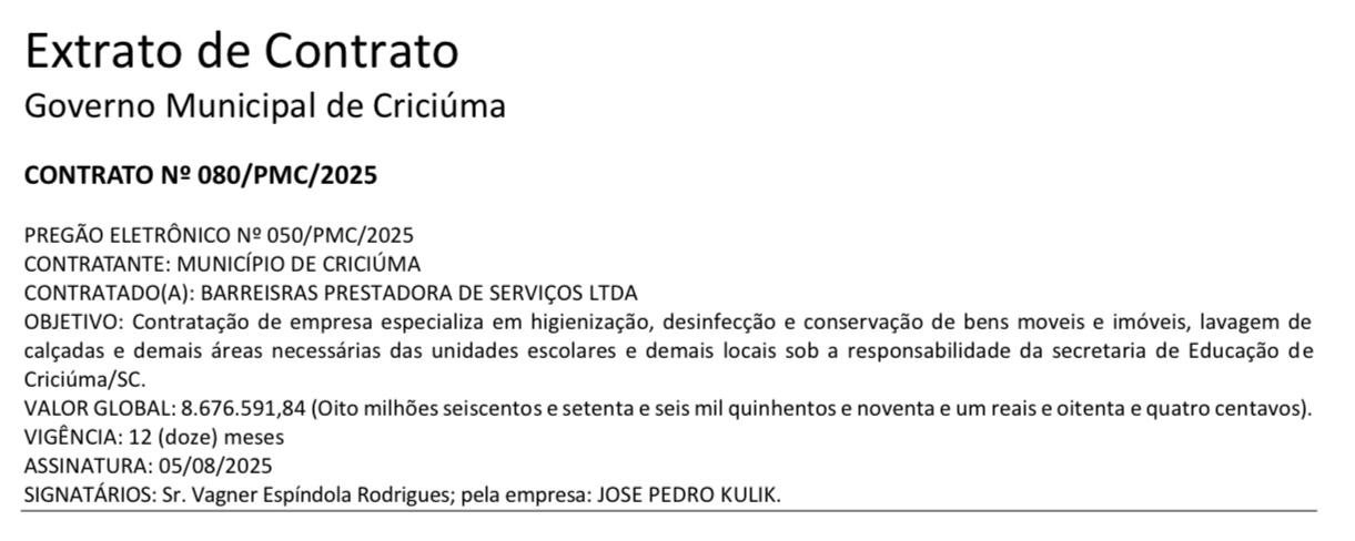Conforme o veículo oficial de comunicação do poder executivo municipal, por um período de 12 meses, a empresa receberá R$ 8.676.591,84 para realizar higienização, desinfecção e conservação de bens moveis e imóveis, lavagem de calçadas e demais áreas necessárias das unidades escolares e demais locais sob a responsabilidade da secretaria de Educação de Criciúma.