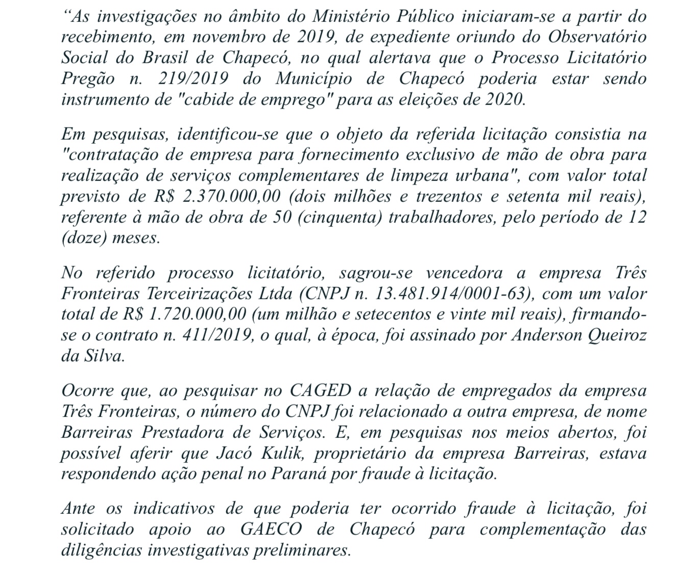 Com exclusividade, o portal Melhores Publicações apurou que as investigações tiveram início após indícios de envolvimento da empresa em fraudes na prestação de serviços de limpeza urbana na cidade de Chapecó.
