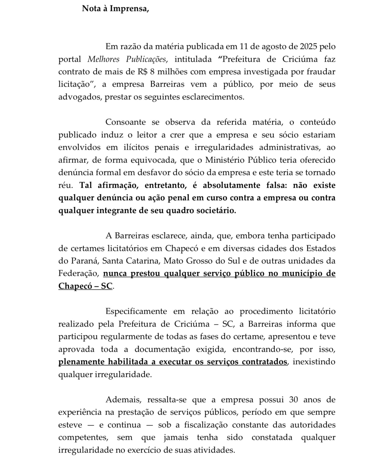 Investigada pelo Grupo de Atuação Especial de Combate às Organizações Criminosas (Gaeco), a empresa Barreiras Prestadora de Serviços Ldta, com sede em Toledo(PR), venceu uma licitação realizada pela Prefeitura Municipal de Criciúma (PMC) e deve receber R$ 8.676.591,84.