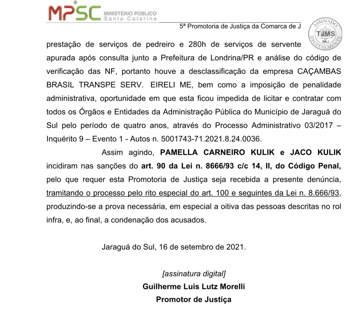 Diante dos crimes, o MPSC denunciou o empresário (que já responde outros processos pelos mesmos crimes) pelos crimes de fraude à licitação e falsificação de documentos. Até o momento, não houve sentença.