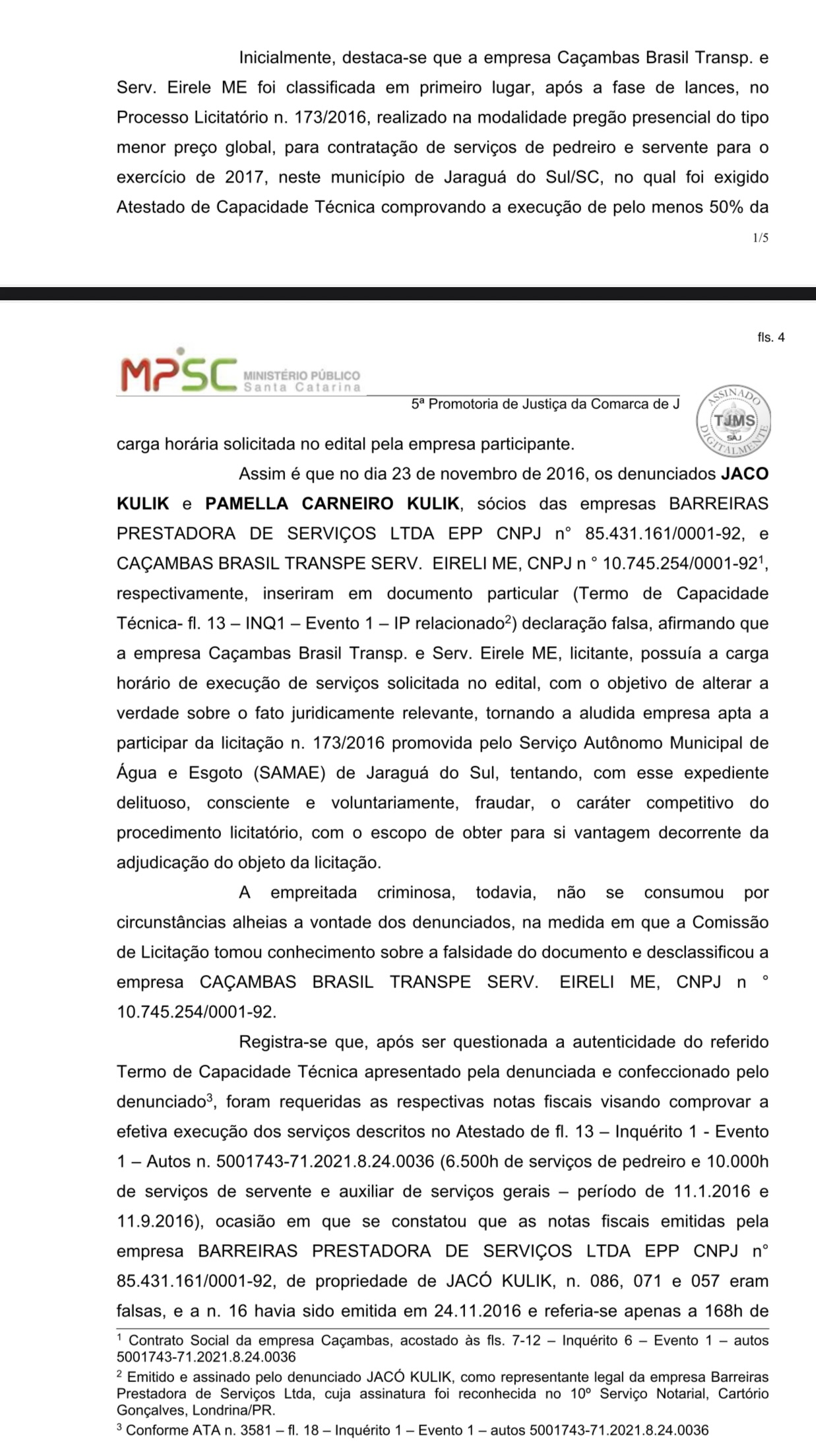 Conforme o Promotor de Justiça Guilherme Luiz Lutz Morelli, com objetivo de alterar a verdade e tornar uma de suas empresas vencedoras da licitação, Jacó Kulik, sócio da Barreira Prestadora de Serviços Ltda, em 2016, inseriu documentos falsos durante os trâmites burocráticos do pregão tentando fraudar o caráter competitivo do procedimento com objetivo de obter vantagens ilícitas.