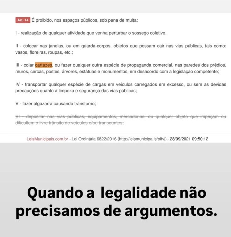 A frase foi acompanhada pela captura de tela do artigo 14 da Lei Municipal n° 6822, que instituiu o Código de Posturas do Município de Criciúma.