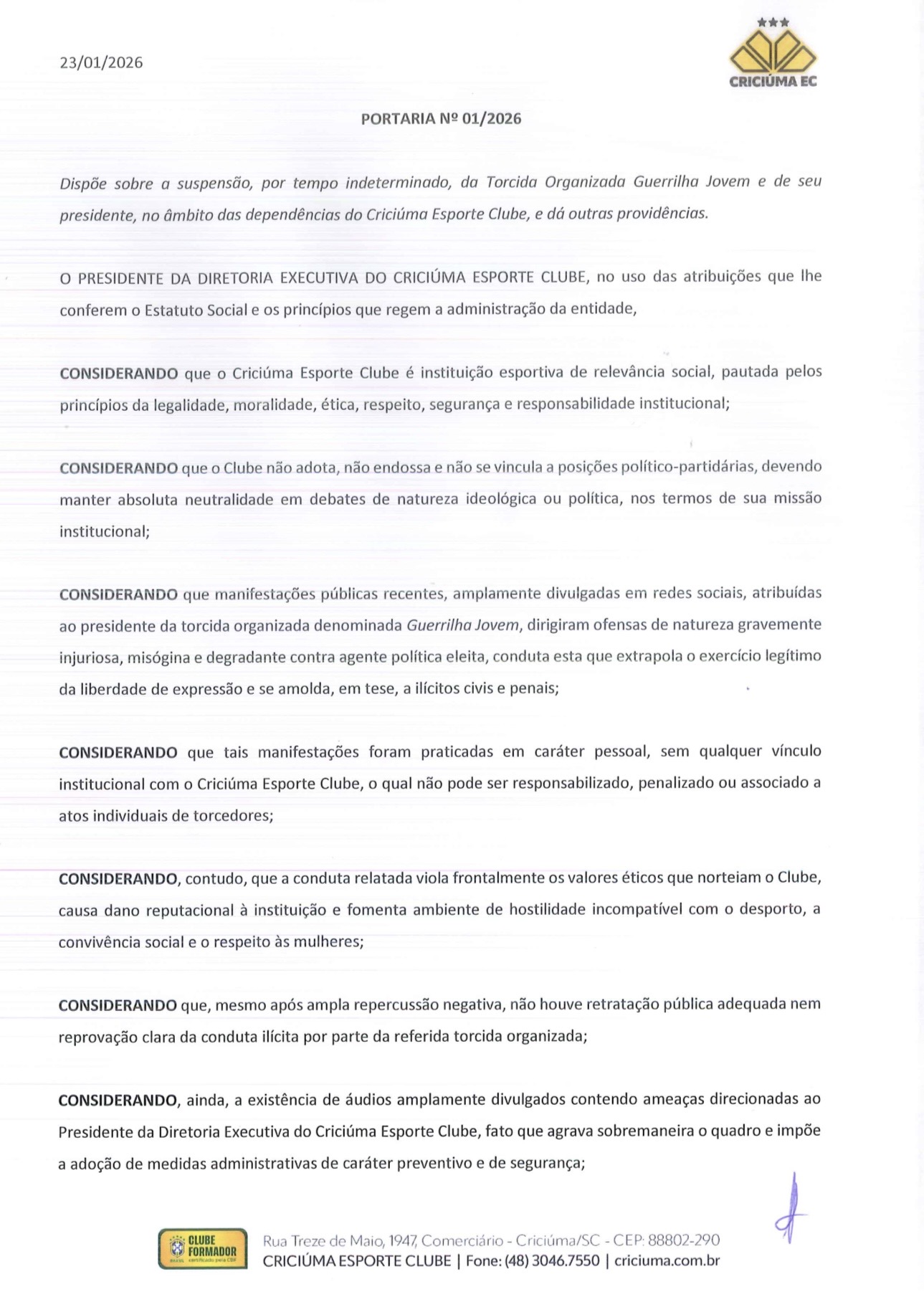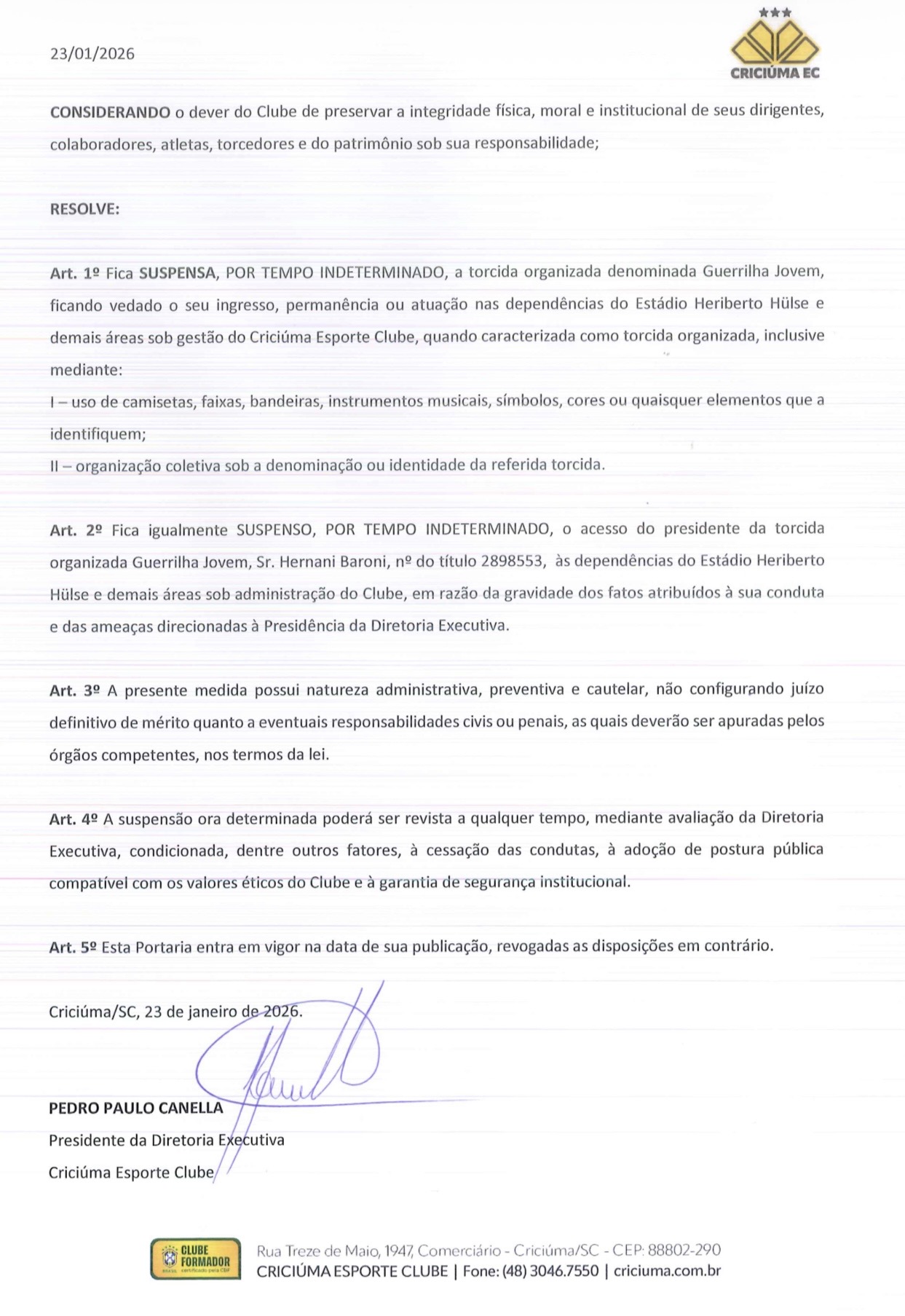 Leia o documento oficial emitido pelo Criciúma Esporte Clube.