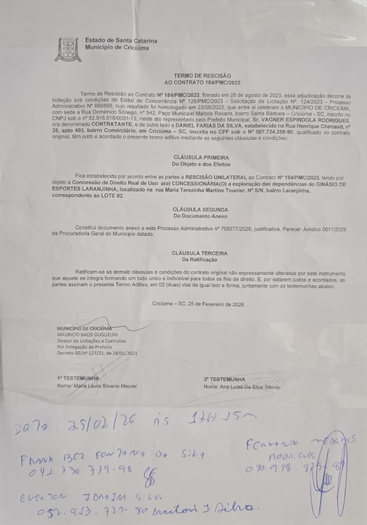 A Prefeitura Municipal de Criciúma (PM) oficializou, após a matéria divulgada pelo portal Melhores Publicações, a rescisão unilateral do contrato de concessão do ginásio de esportes do bairro Laranjinha, em Criciúma. O anúncio foi feito por meio de um Termo de Recisão.
