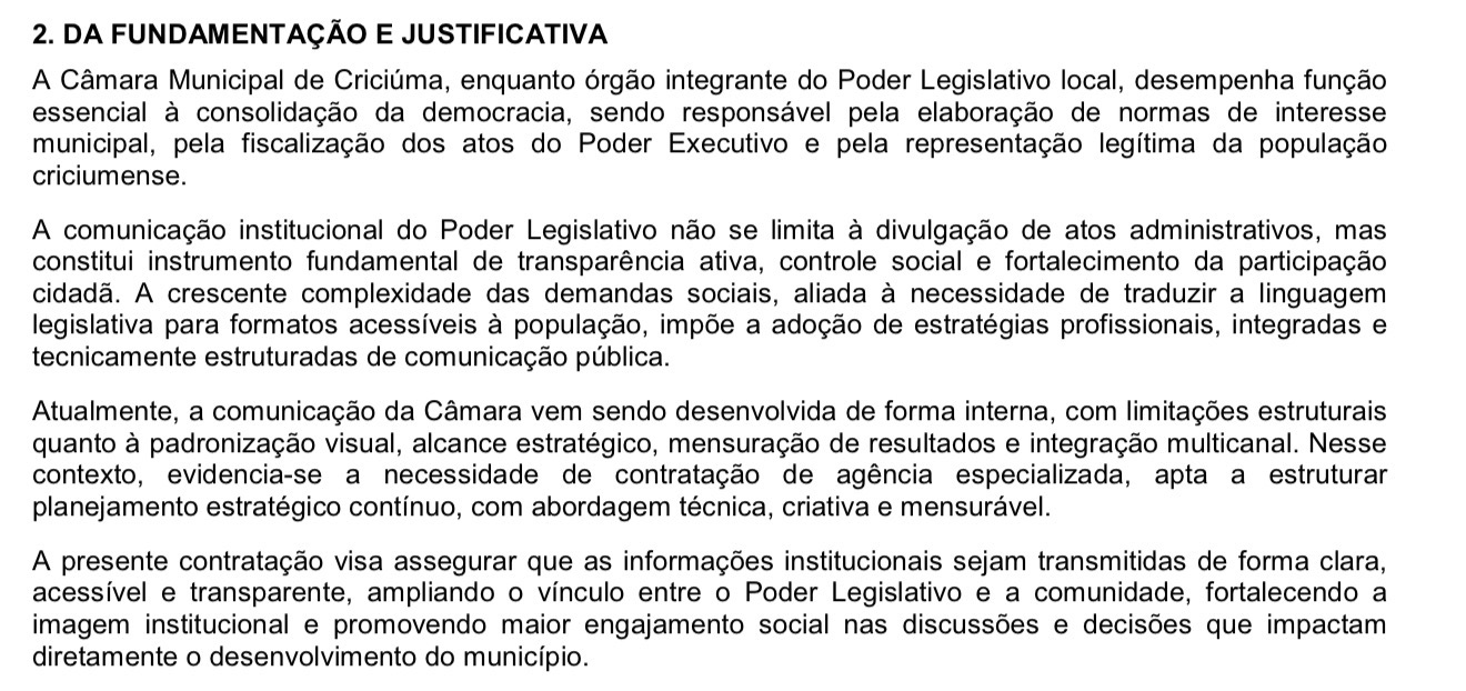 A Câmara Municipal de Criciúma abriu processo licitatório para contratar uma agência de publicidade que ficará responsável pelos serviços de comunicação institucional do Legislativo. O contrato terá vigência de 12 meses, a contar da assinatura, com valor estimado em R$ 2,5 milhões.