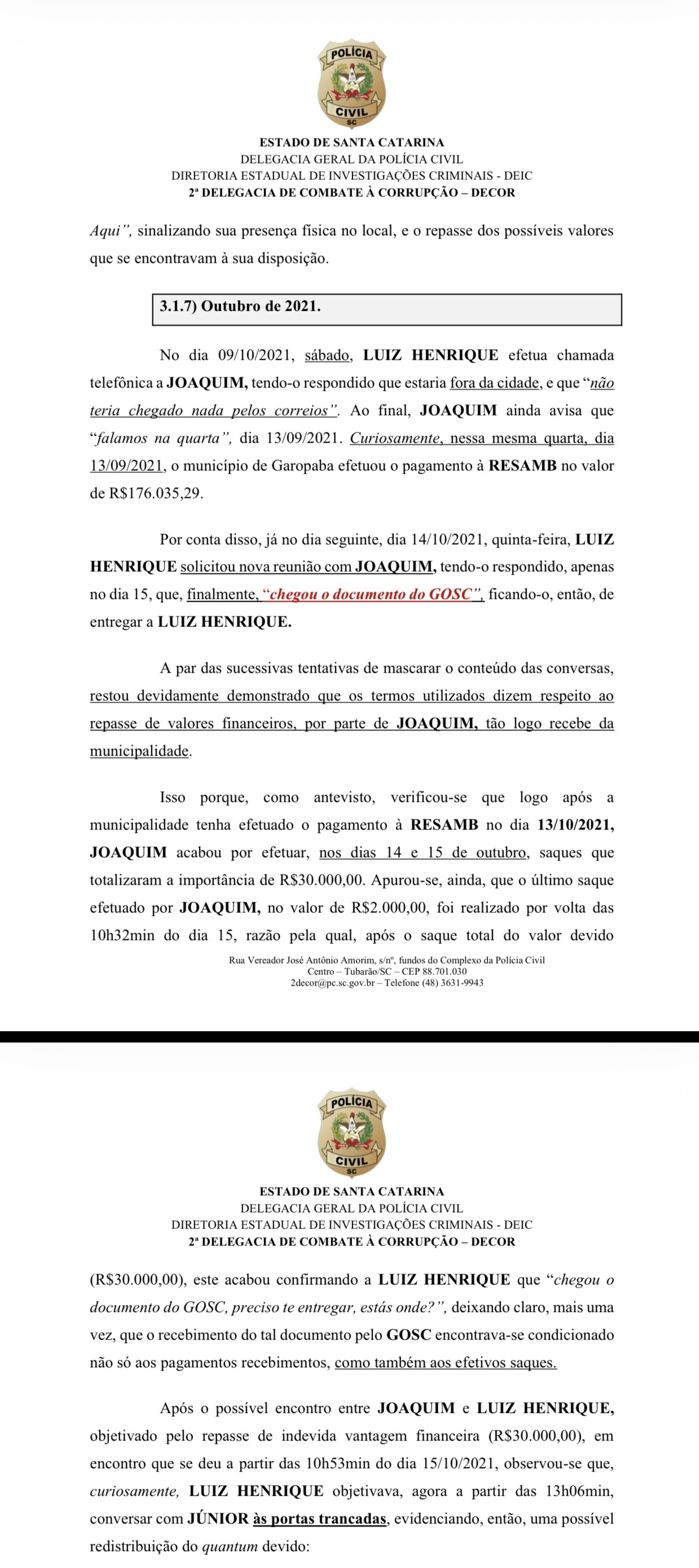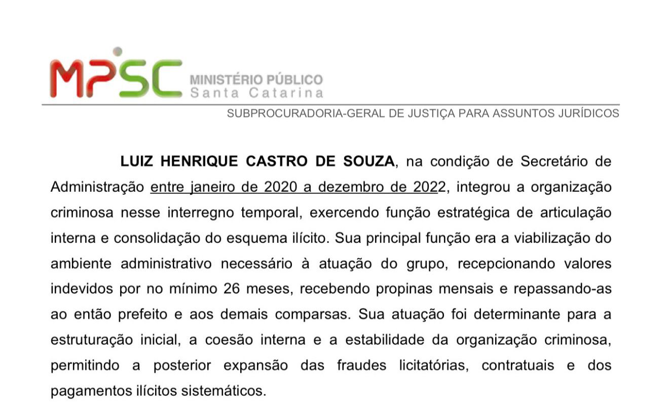 Conforme o Ministério Público de Santa Catarina (MPSC), a atuação orquestrada da organização criminosa foi tão eficaz que rendeu aos agentes públicos — incluindo o prefeito Henrique — valores que superam R$ 1,4 (um milhão e quatrocentos mil reais), pagos a título de propina.