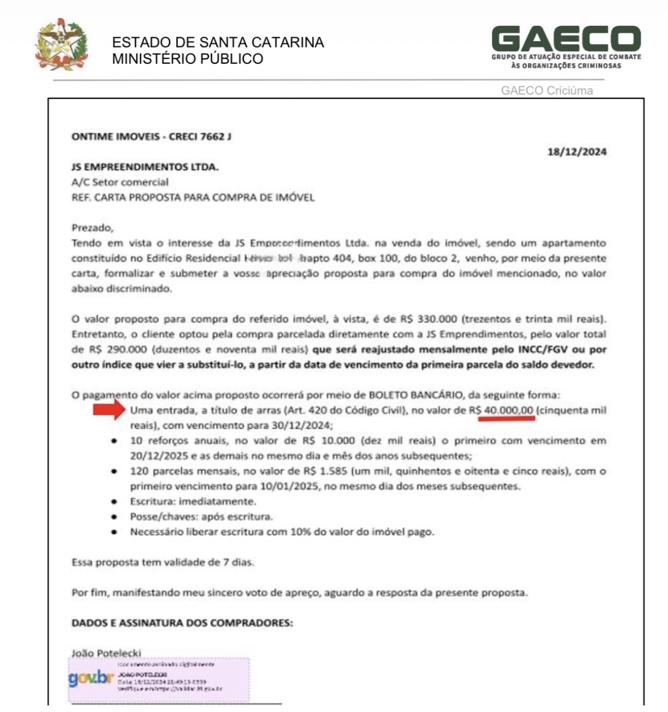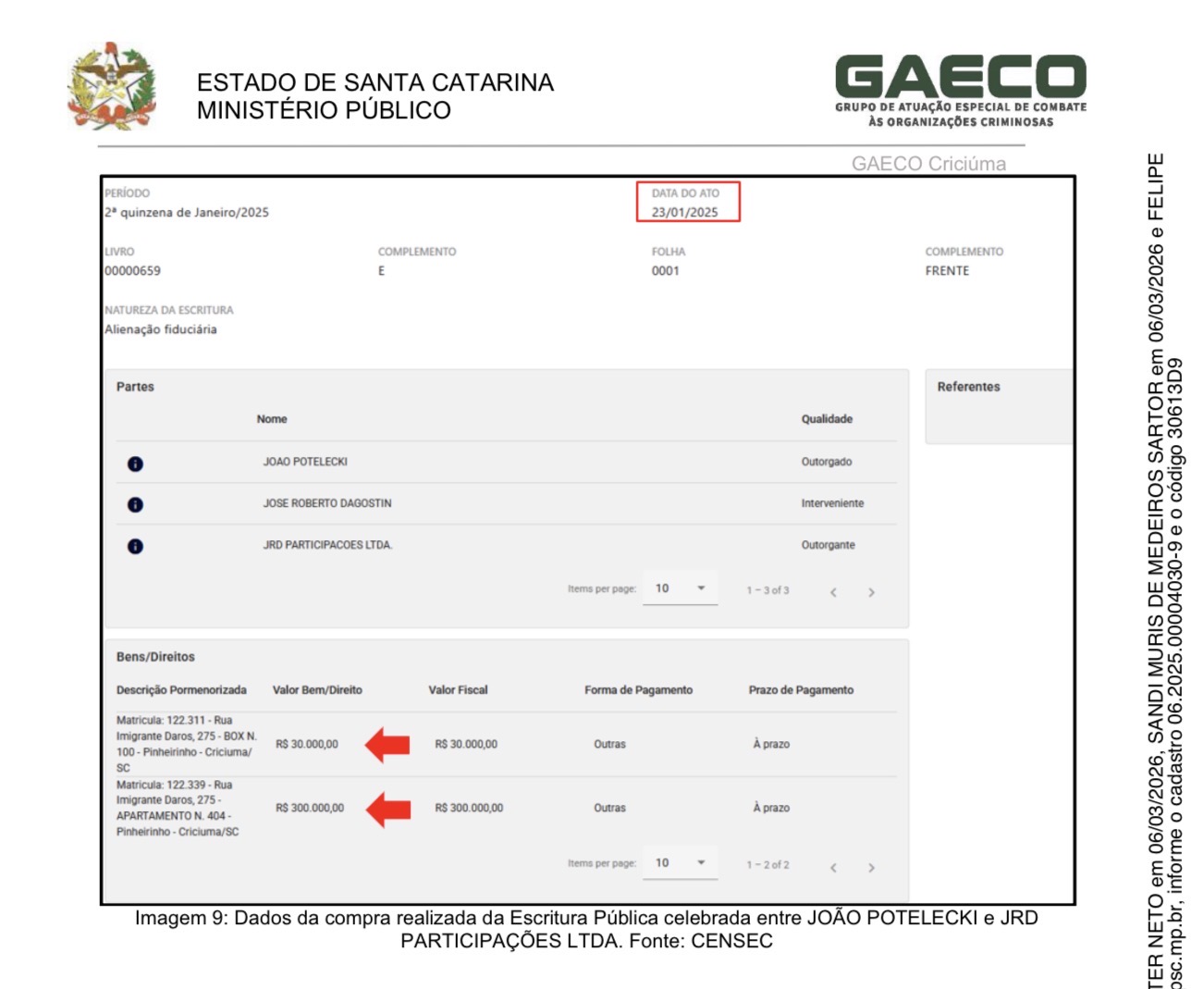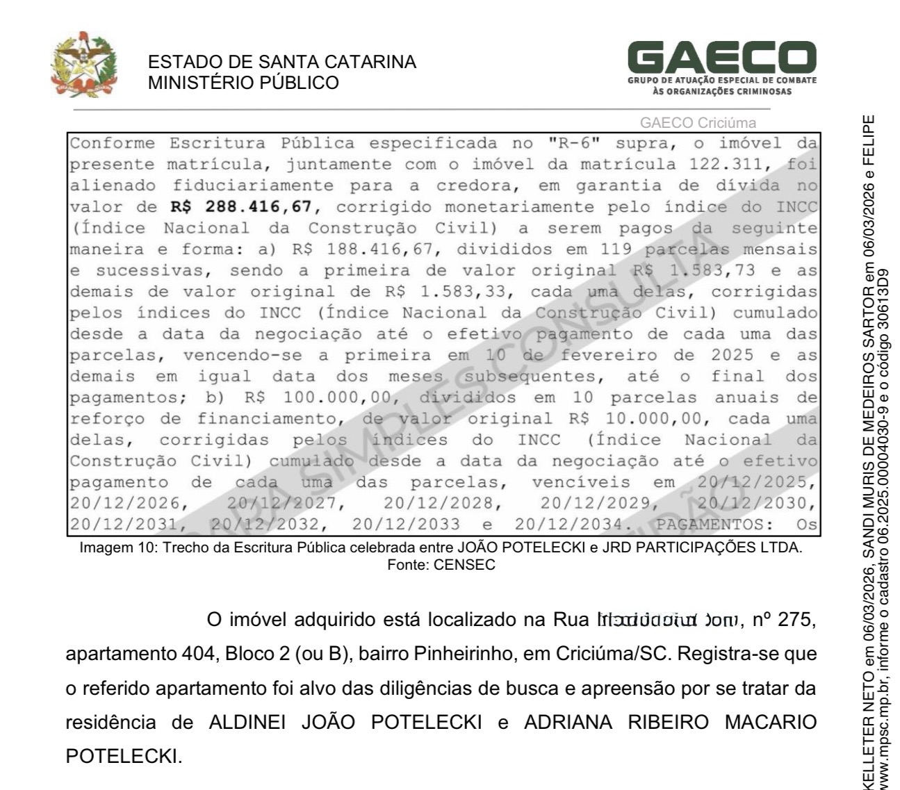 Após a operação deflagrada em fevereiro, o Gaeco encontrou, no aparelho celular de Potelecki, um documento com proposta de compra de um imóvel, datado de 18 de dezembro de 2024, assinado por João Potelecki, filho do casal investigado.