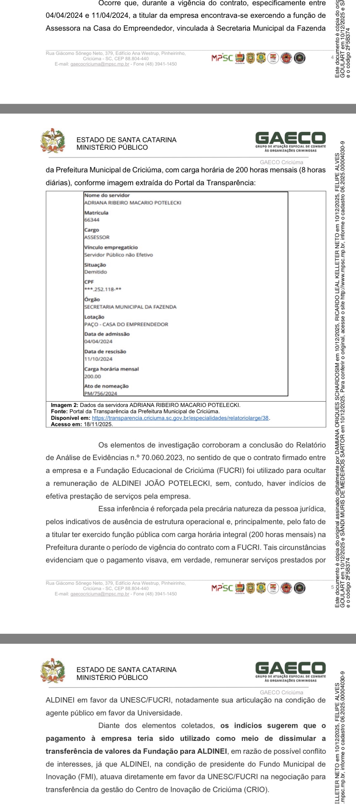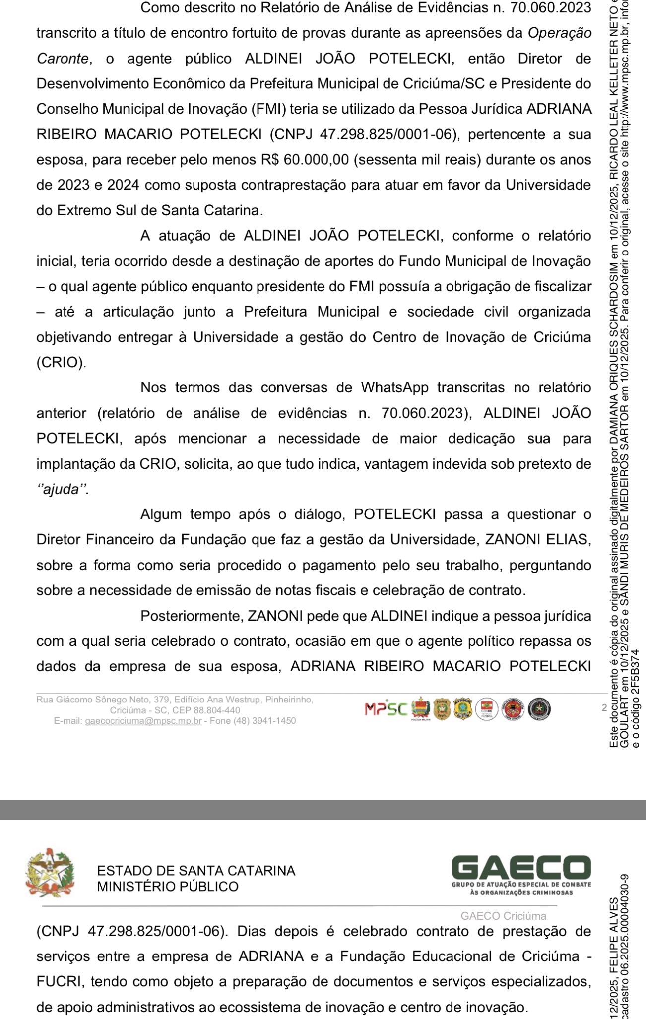 Diante disso, segundo o Gaeco, na condição de diretor de Desenvolvimento Econômico do município, Potelecki teria atuado para viabilizar o repasse do valor restante à universidade, bem como articulado para que a Unesc assumisse a administração do CRIO. Em contrapartida, de acordo com o MPSC, o vereador teria recebido ao menos R$ 60 mil em vantagem indevida da instituição.
