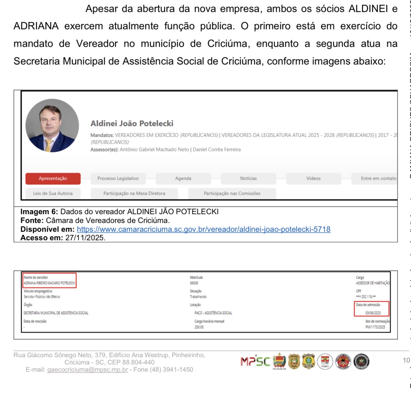 O vereador de Criciúma, Aldinei Potelecki (Republicanos), teria utilizado o próprio filho como “laranja” para adquirir um apartamento com recursos supostamente oriundos de propina, aponta o Grupo de Atuação Especial de Combate às Organizações Criminosas (Gaeco).