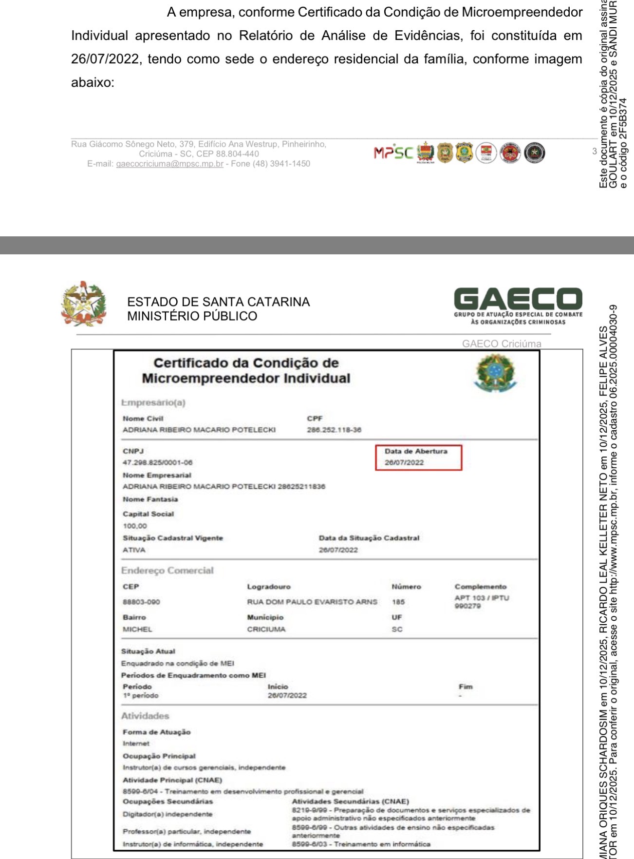 A empresa foi encerrada logo após o término do contrato com a Unesc. Há indícios de que uma nova empresa, constituída por Potelecki e Adriana em julho de 2025, possa estar sendo utilizada com a mesma finalidade.